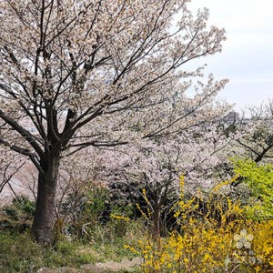 境内の様子 天神山の桜と花々 2022.4.2 天神山の桜並んで写っている黄色い花はレンギョウと言うそうです。天神山の山頂の浅間社近くの斜面に咲いています。 レンギョウは俳句の春の季語にもなっているそうです。 よく見ると、緑の色が夏の訪れを一足早くお知らせしていますね。 季節ごとの天神山の自然をお楽しみください。 Post 本日の桜 駐車場拡張工事と梅の移植