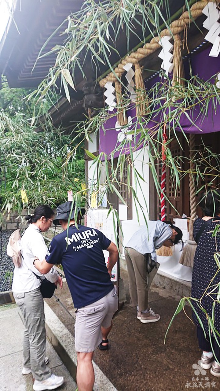(4/6)茅の輪くぐりを終え、神前に進み拝礼する参列者、拝礼の後、記入した七夕の短冊を楽し気に笑顔で話しながら笹に結びつけていました。